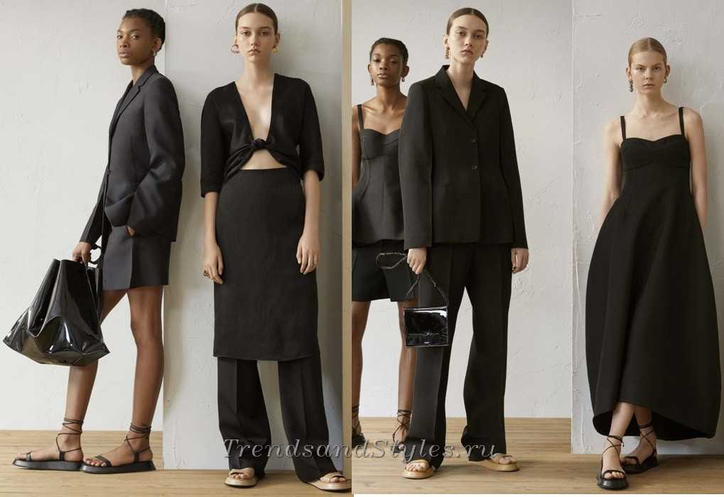 Сюда подойдут и вещи из денима, и офисные лаконичные комплекты из брюк и водолазки, лаконичной рубашки и женственные тандемы с юбками миди и мини в трапециевидном решении из денима, шерсти, твида, кожи и т.д.