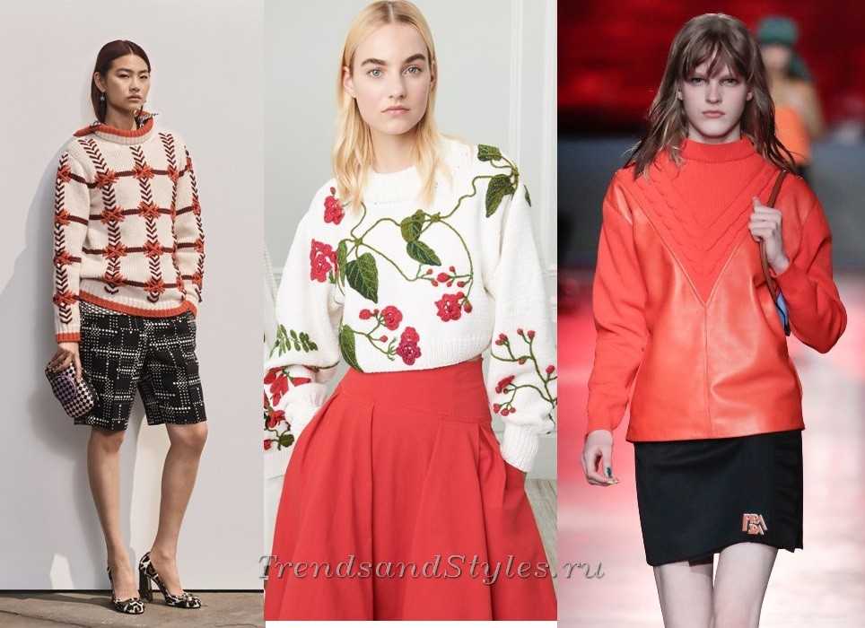 Bottega Veneta, Oscar de la Renta, Prada, Louis Vuitton, Sportmax в модных образах акцентируют внимание на интересное исполнение такой женской одежды. Изюминкой актуального лука может стать узор, нашивки на свитере, комбинирования кожи и трикотажа, разрезы на рукавах или линии низа