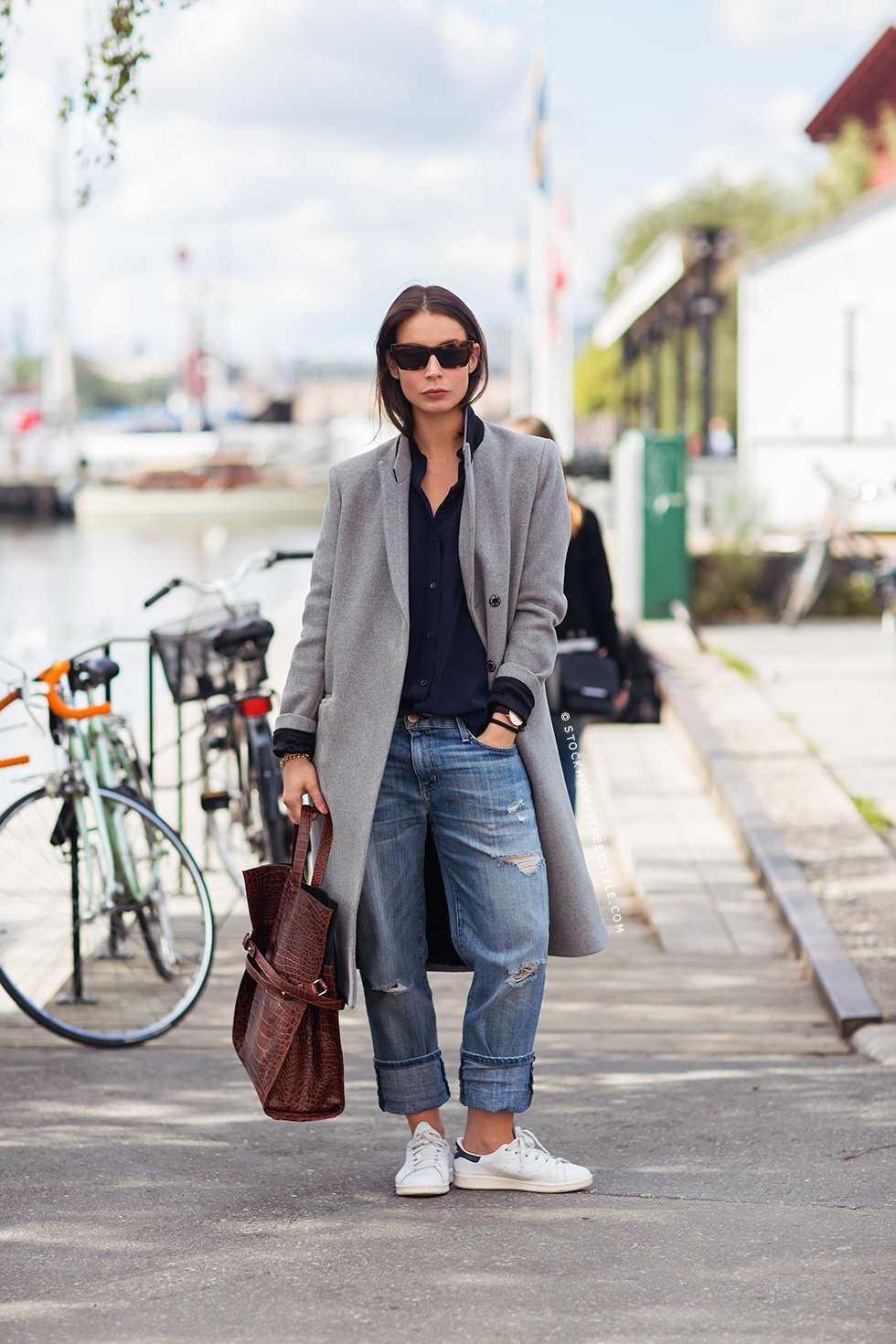 - Еще один вариант на все случаи жизни для весны или прохладного лета — кроссовки лаконичного дизайна и расцветки, блейзер в тон, длинное черное пальто-плащ со слегка подвернутыми рукавами и серые облегающие укороченные джинсы. Плюс объемная кожаная сумка.