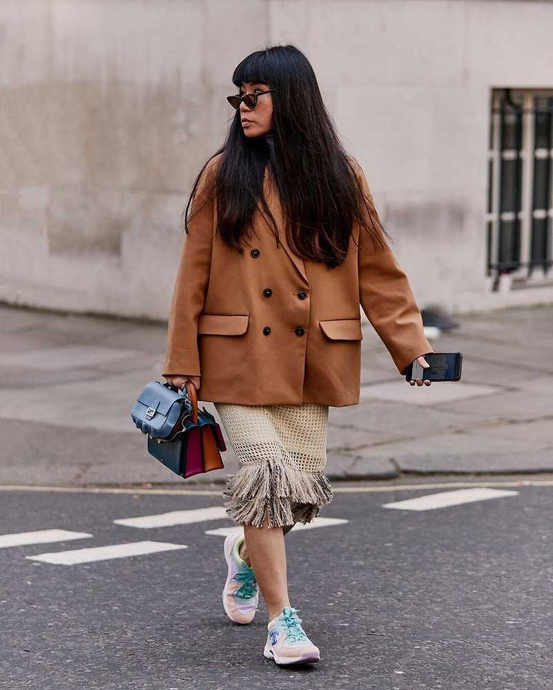 - стейтмент, или пальто, по форме напоминающее удлиненный деловой мужской пиджак, — кроссовки не позволят ему выглядеть слишком строго, чопорно, добавят в образ свободы, игривости;