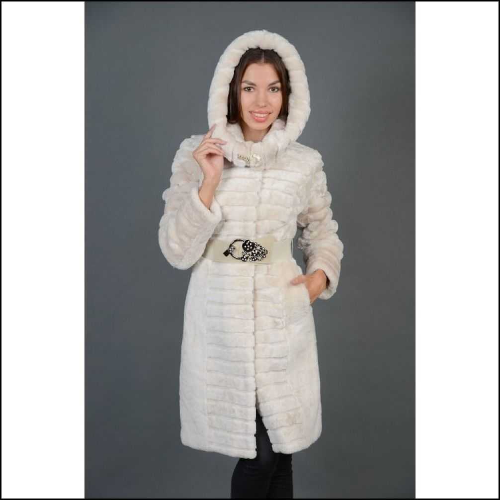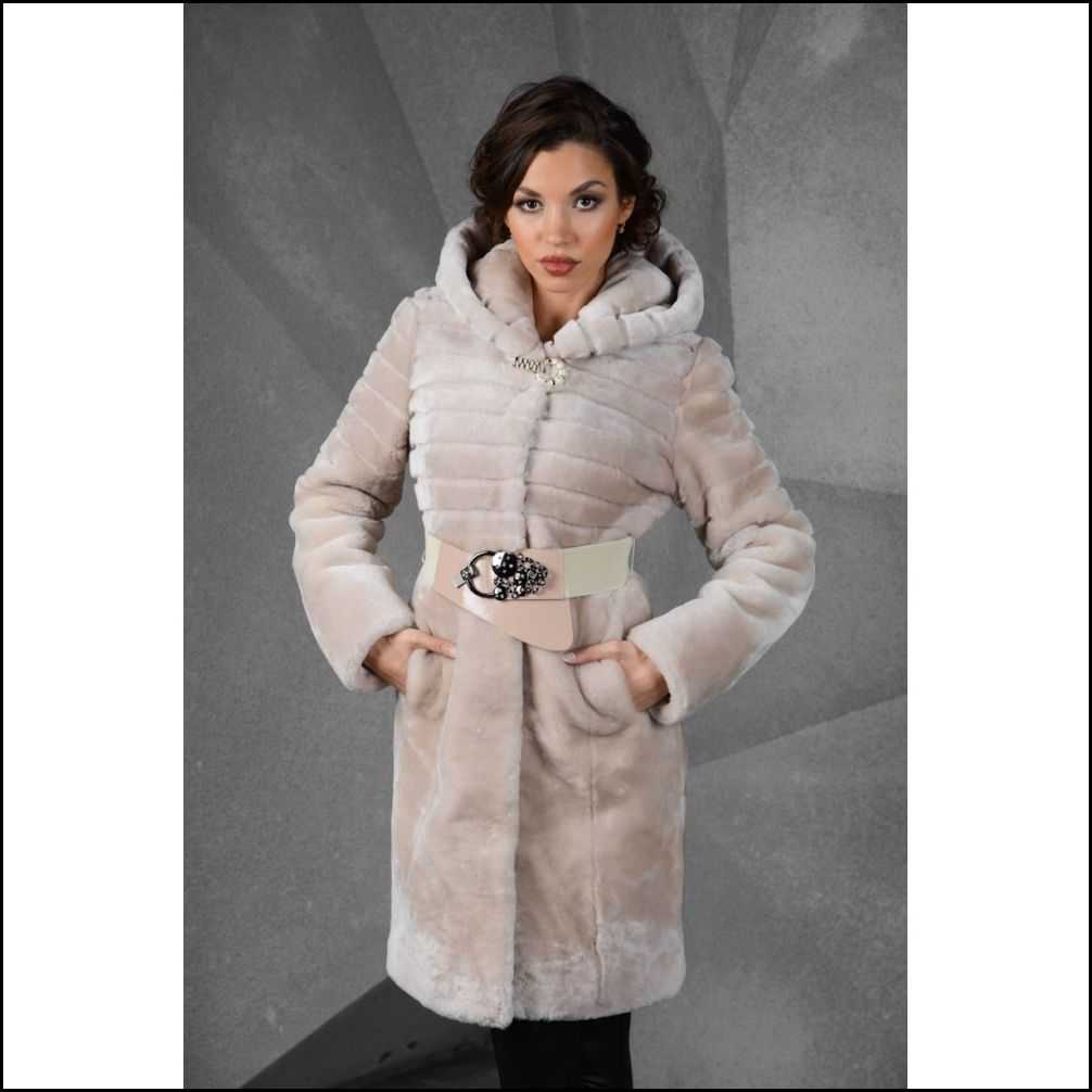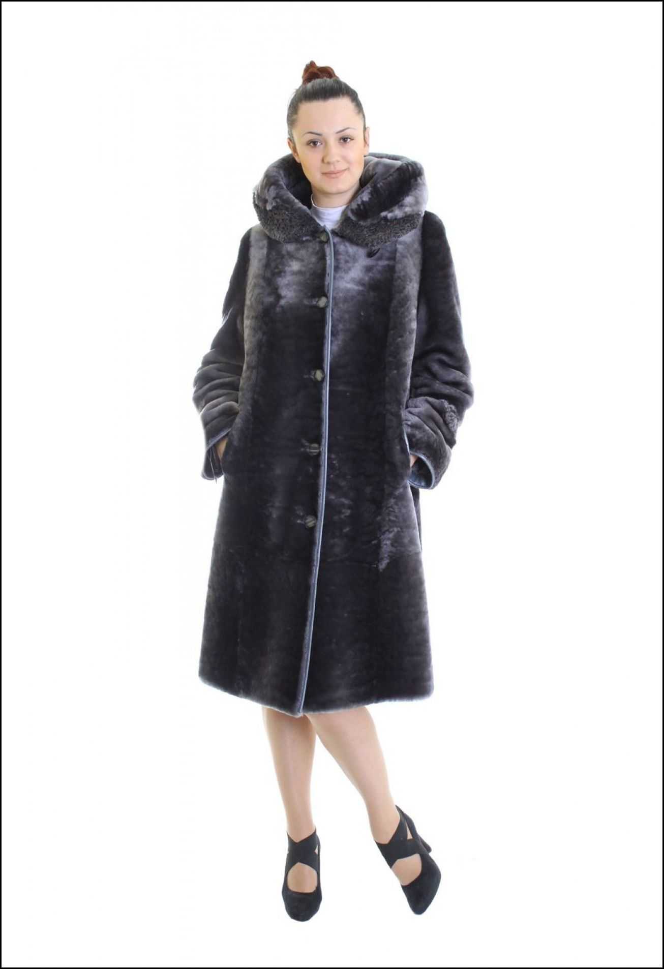 - Актуальна шуба из мутона с капюшоном с отложным воротников, из-за чего она внешне схожа с пальто.