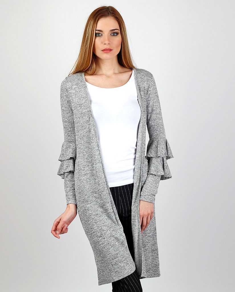 - С оборкой и накладными карманами. Подходящий вариант для весны и осени. Вставки просты и практичны, имеют насыщенную расцветку. Кардиганы с оборкой и изящными воланами позволяют воплощать романтичные образы. Сочетаются с блузками, легкими платьями, джинсовой тканью.
