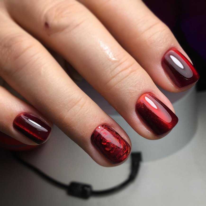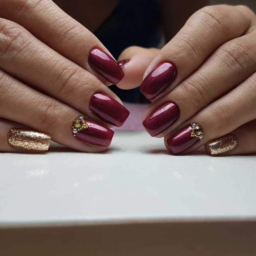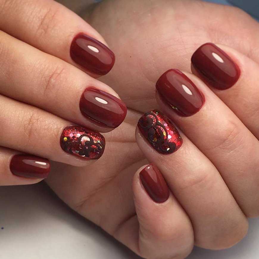 В зависимости от сезона можно использовать теплые или холодные оттенки темно-красного. Например, насыщенный и однотонный красный цвет в сочетании с винным станет отличным вариантом осеннего маникюра. Данную идею можно дополнить, разбавив однообразие золотистыми блестками.