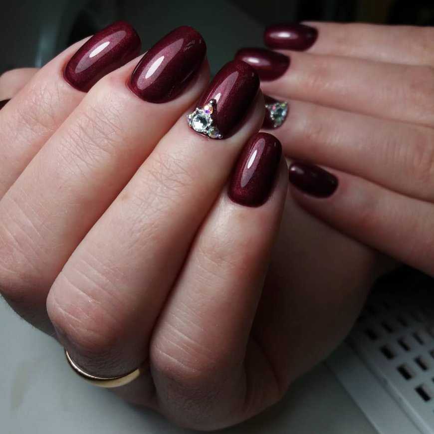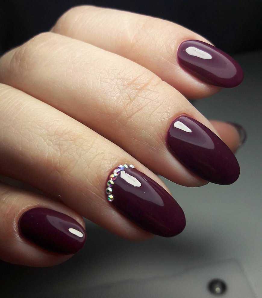 Галька или стразы послужат богатым украшением вашего маникюра — отогните из страз определенную форму или хаотично разложите их по поверхности ногтя. Ваша фантазия ничем не ограничена и вы имеете право создать свой неповторимый стиль, а винный оттенок добавит роскоши.
