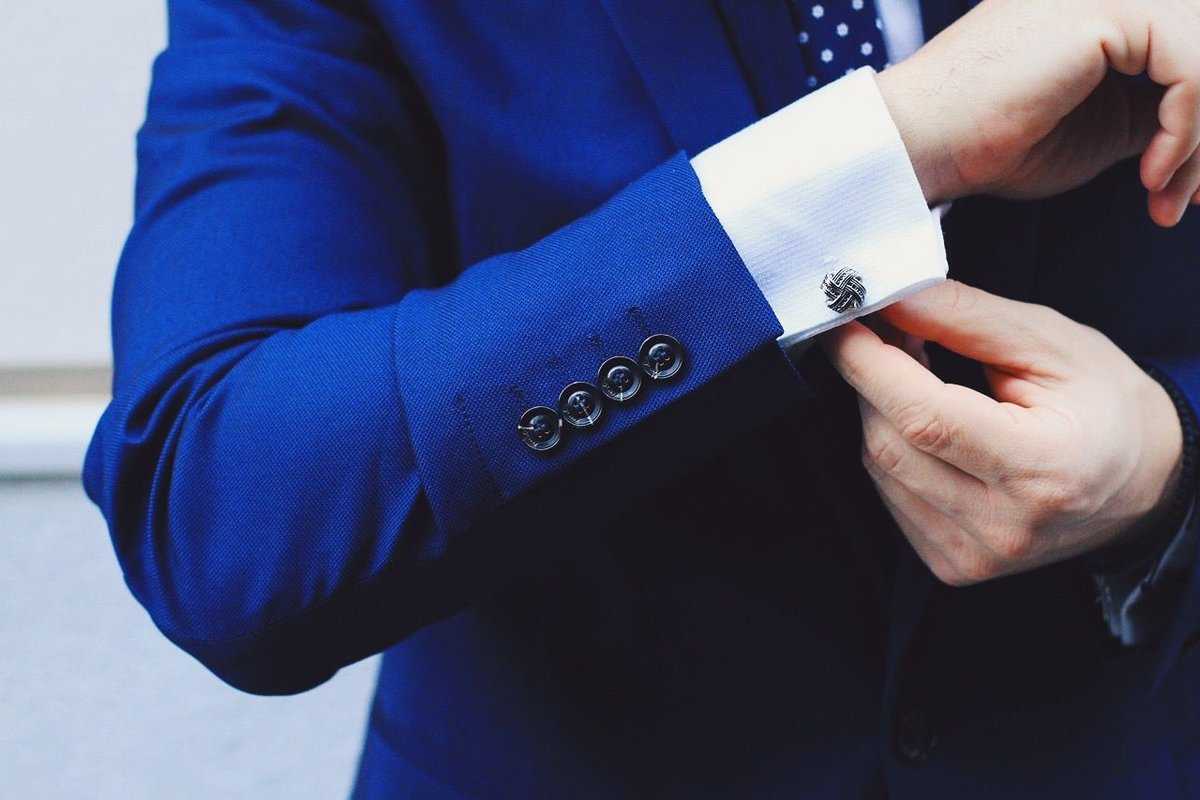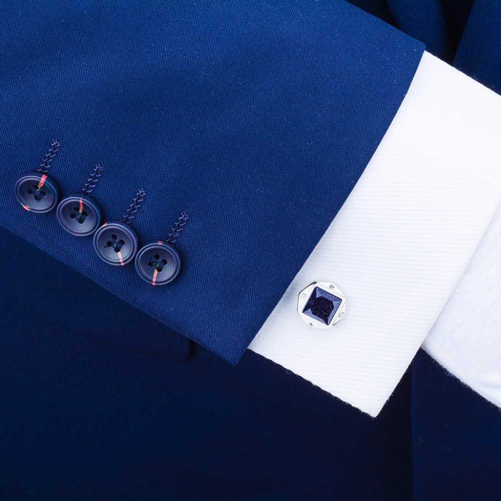 Для синего костюма лучше выбрать запонки с насыщенными синими камнями, покрытые эмалью. Такой образ будет уместен и на деловом ужине, и на праздничном мероприятии. Такой ансамбль очень подойдет голубоглазым мужчинам и подчеркнет глубину и выразительность взгляда.