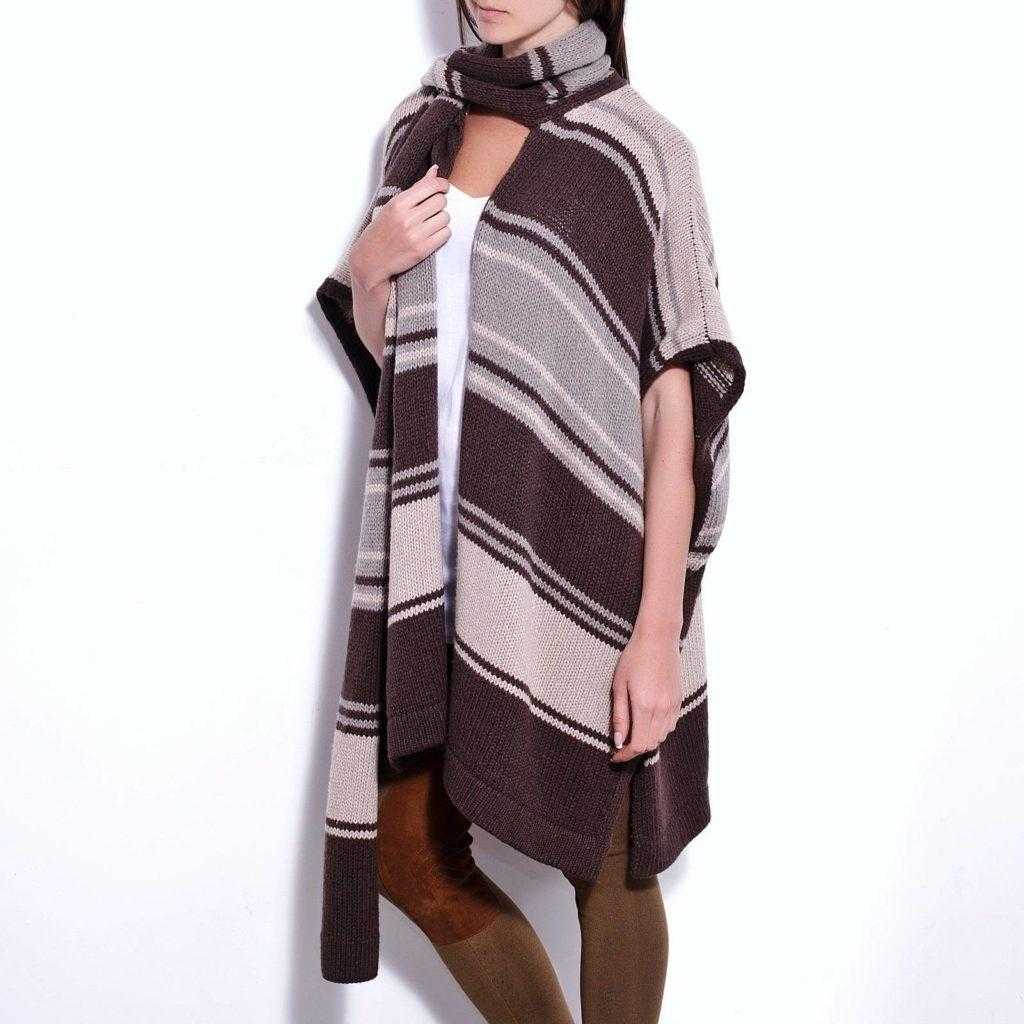 Довольно необычная модель пончо шарф, но не менее актуальна. Это аксессуар, который имеет форму пончо. Так как его размер разнообразен, можно повязать как шарф, или накидывается на плечи, а также можно закрепить поясом на талии. Отлично смотрится с разной одеждой. Такая модель придает образу свежести и индивидуальности.
