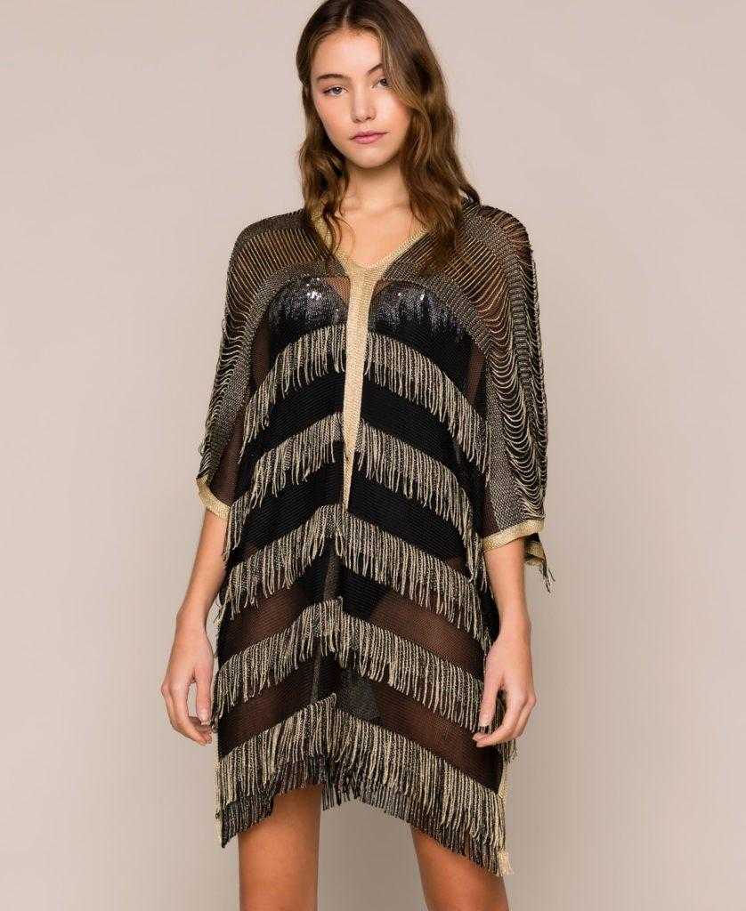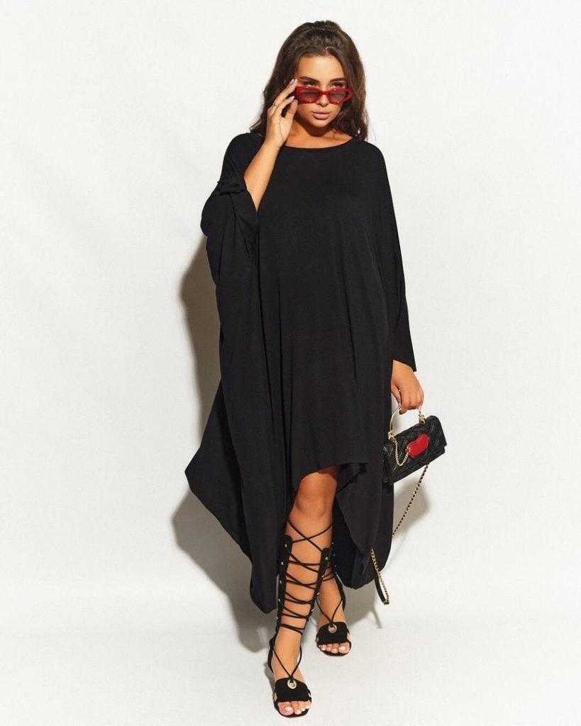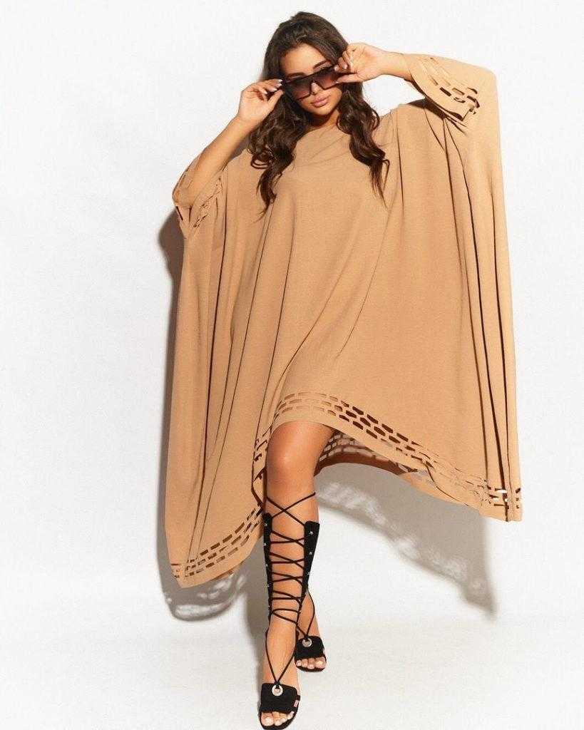 Экстравагантно смотрится пончо платье. Это такая модель, которая не требует дополнений, а носится как самодостаточный наряд. Оно имеет прорези для рук или рукав, а также горловину. Цельное, без пуговиц. Такой крой отлично скрадывает недостатки, и стройнит силуэт.