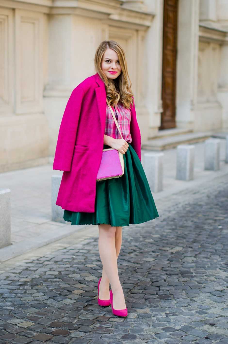 Это смелое сочетание малинового цвета обязательно должно быть разбавлено какой-то вещью нейтрального оттенка, чтобы разбавить изобилие розового цвета. Аксессуары стоит использовать по минимуму, а вещи должны быть простого кроя.