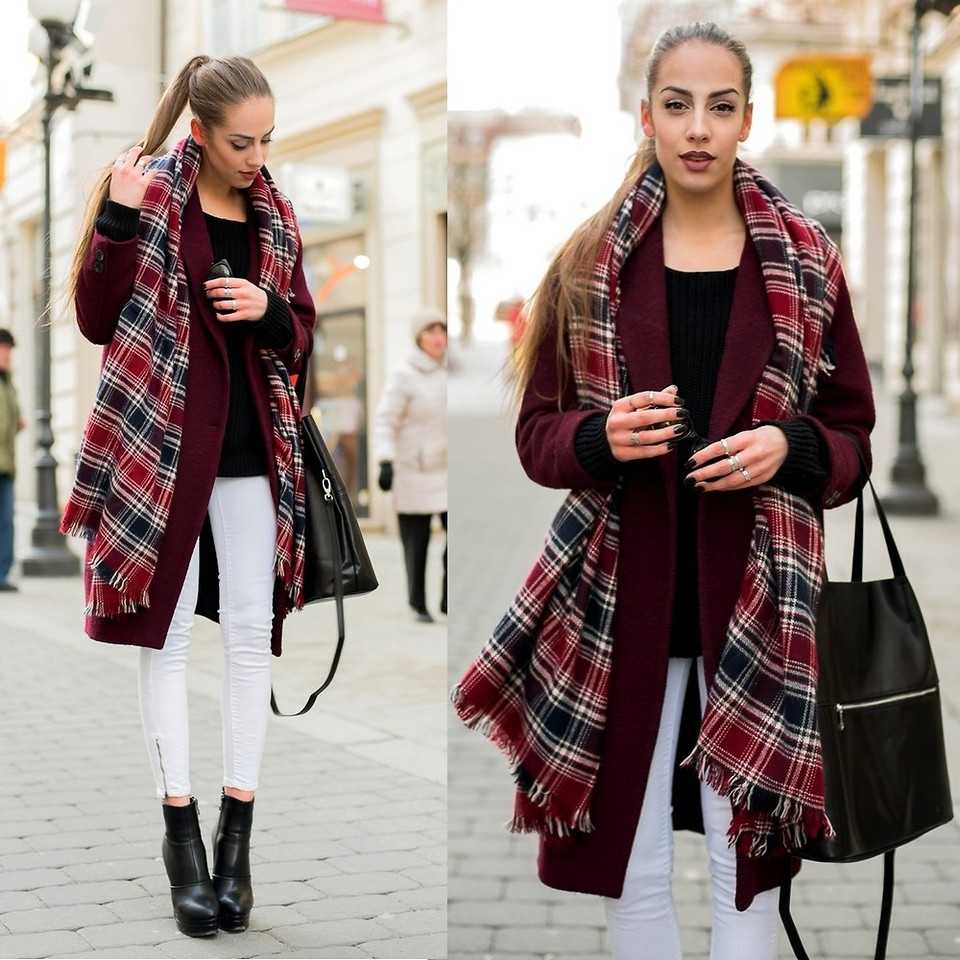 Отлично освежит повседневный образ светло-розовый или белоснежный шарф, а серый палантин поможет выгодно дополнить деловой look. С бордовой верхней одеждой хорошо смотрятся и чёрные снуды, но модели такого цвета рекомендуется выбирать юным девушкам, поскольку подобное сочетание способно прибавить несколько лет к реальному возрасту.
