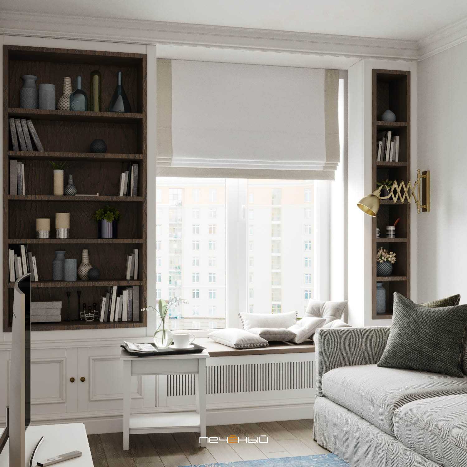 А вот пример гостиной в стиле неоклассика. Здесь серый цвет исполняет роль акцентного фона, а синий – акцента-предмета. Плитка в прихожей и ковёр как бы объединяют эти тона вместе, что придаёт всему интерьеру законченность.