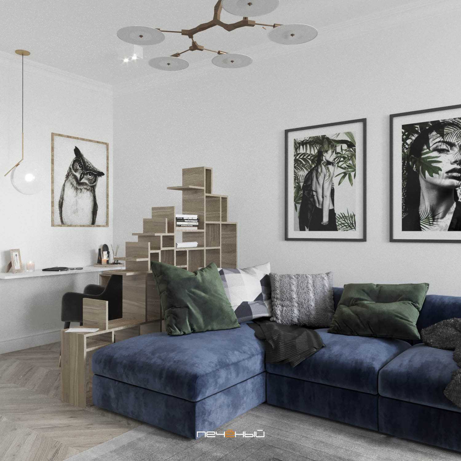 Ещё один вариант соединения в интерьере современной лаконичности и классической изысканности. Серо-синяя гамма тут очень уместна – она добавляет графичности и в целом, гостиная смотрится свежей и очень нарядной.