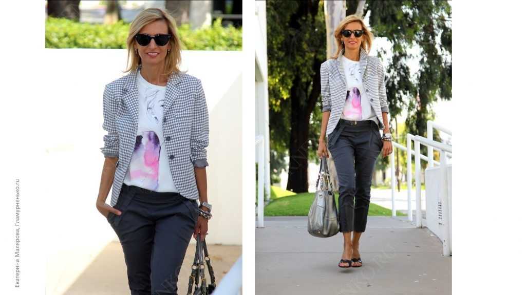 Если бы на женщине был костюм в гусиную лапку, состоящий из классической юбки и жакета, получился бы скучный образ. А тут жакет сочетается с укороченными брюками и топом с ярким принтом.