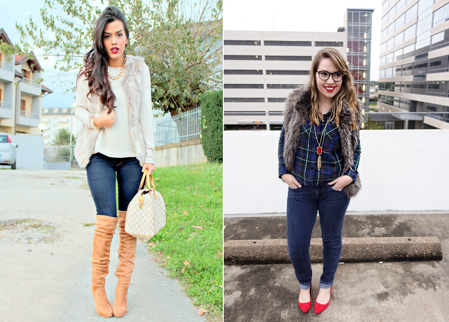 Носить безрукавку можно в межсезонье и теплыми зимними днями, если мороз не высокий. Кроме того, пушистый мех жилета и обнаженные руки позволяют создать стильный лук.