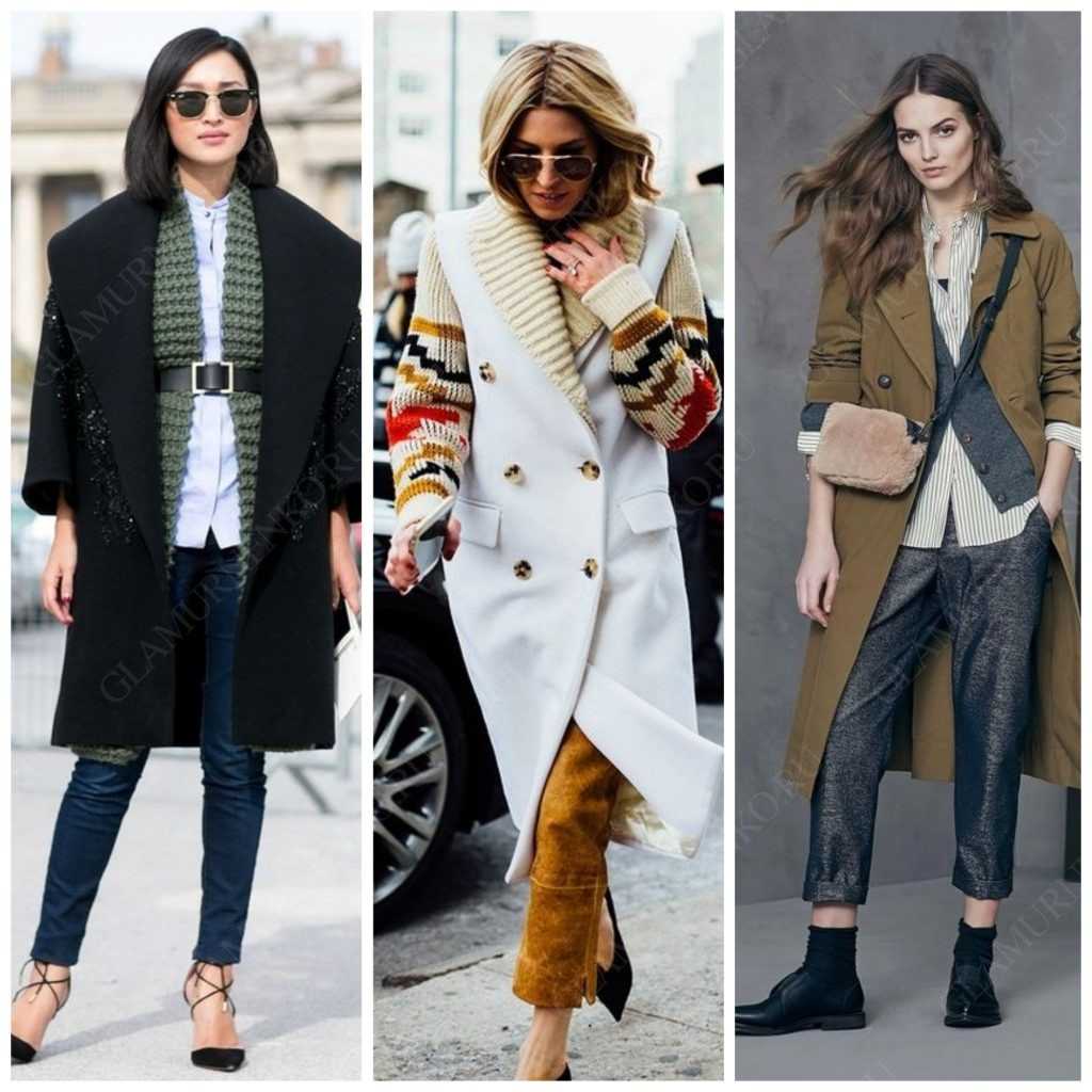 Примеры многослойности верхней одежды: кардиган крупной вязки и пальто; кардиган крупной вязки и жилет; пальто и короткий кардиган тонкой вязки