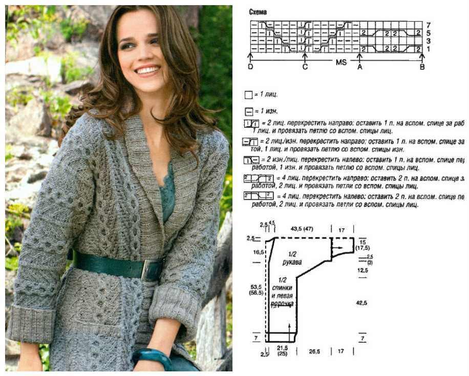 Следующая модель пальто вяжется целиком. Начинается вязание снизу спинки. Данная модель связана из шерстяной пряжи. Для вязания понадобятся прямые и круговые спицы. Схема узора приведена на фото. Края пальто и рукава оформлены в виде английской резинки с чередованием петель 3×3.