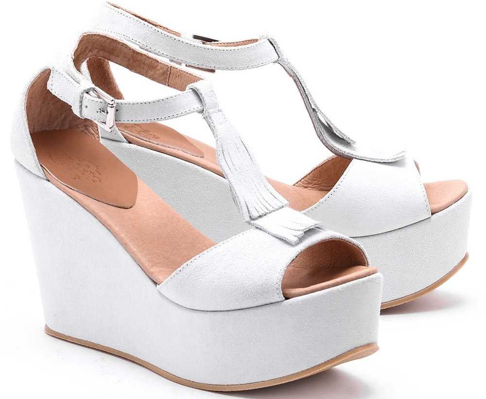 Чтобы серые босоножки на танкетке смотрелись дорого, выберите модель из натуральной замши. А для создания стильного и элегантного образа, подбирайте к ним только дорогой белый цвет.