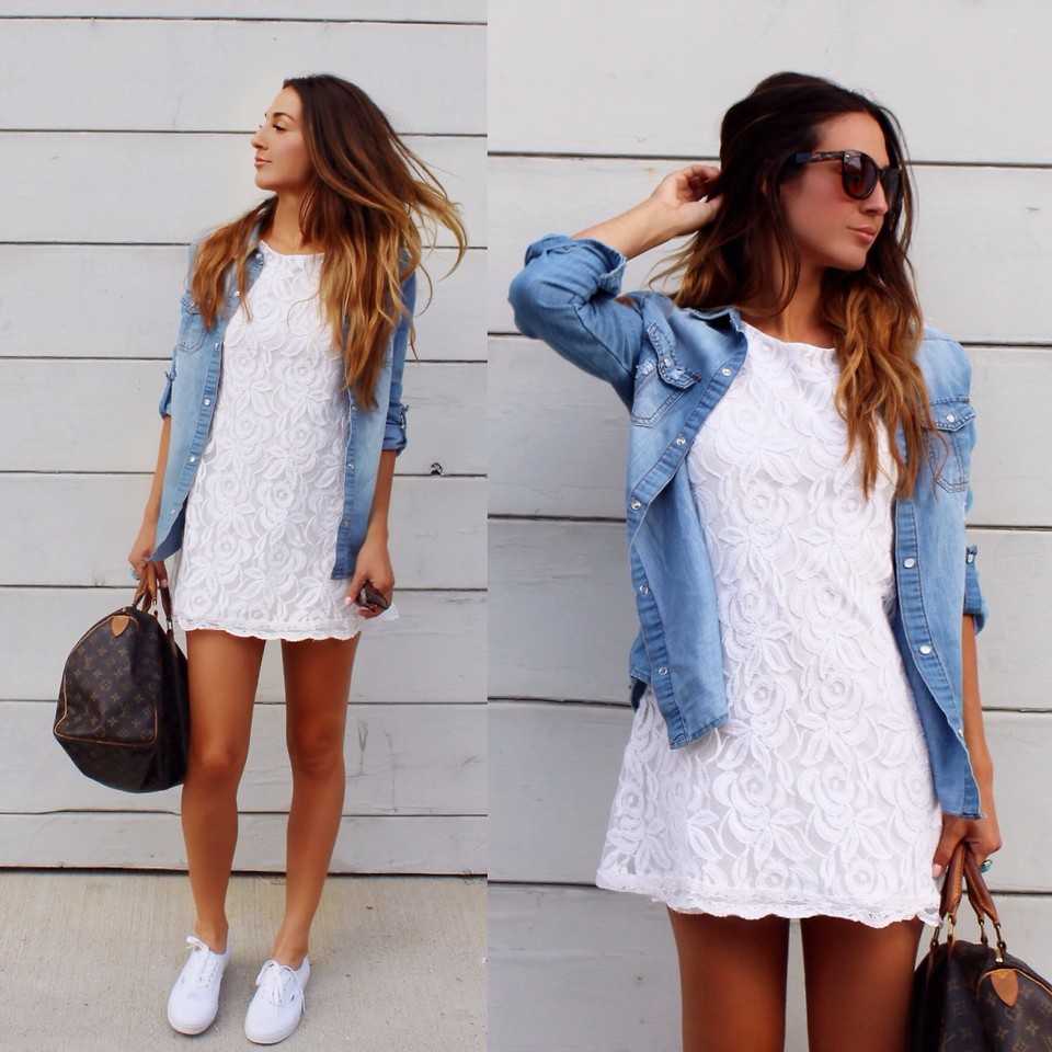 Раз мы сказали, что кеды ничем не хуже туфель на каблуке, то нужно это обосновать. И воспользуемся мы вот таким аргументом: кеды отлично смотрятся со многими платьями и юбками. Так, вы можете носить легкое короткое черное или белое платье (хоть однотонное, хоть в горошек), приталенное или свободное, с черными или белыми конверсами, которые, в свою очередь, могут быть как высокими, так и укороченными. Образ можно дополнить джинсовой безрукавкой или белым жакетом.