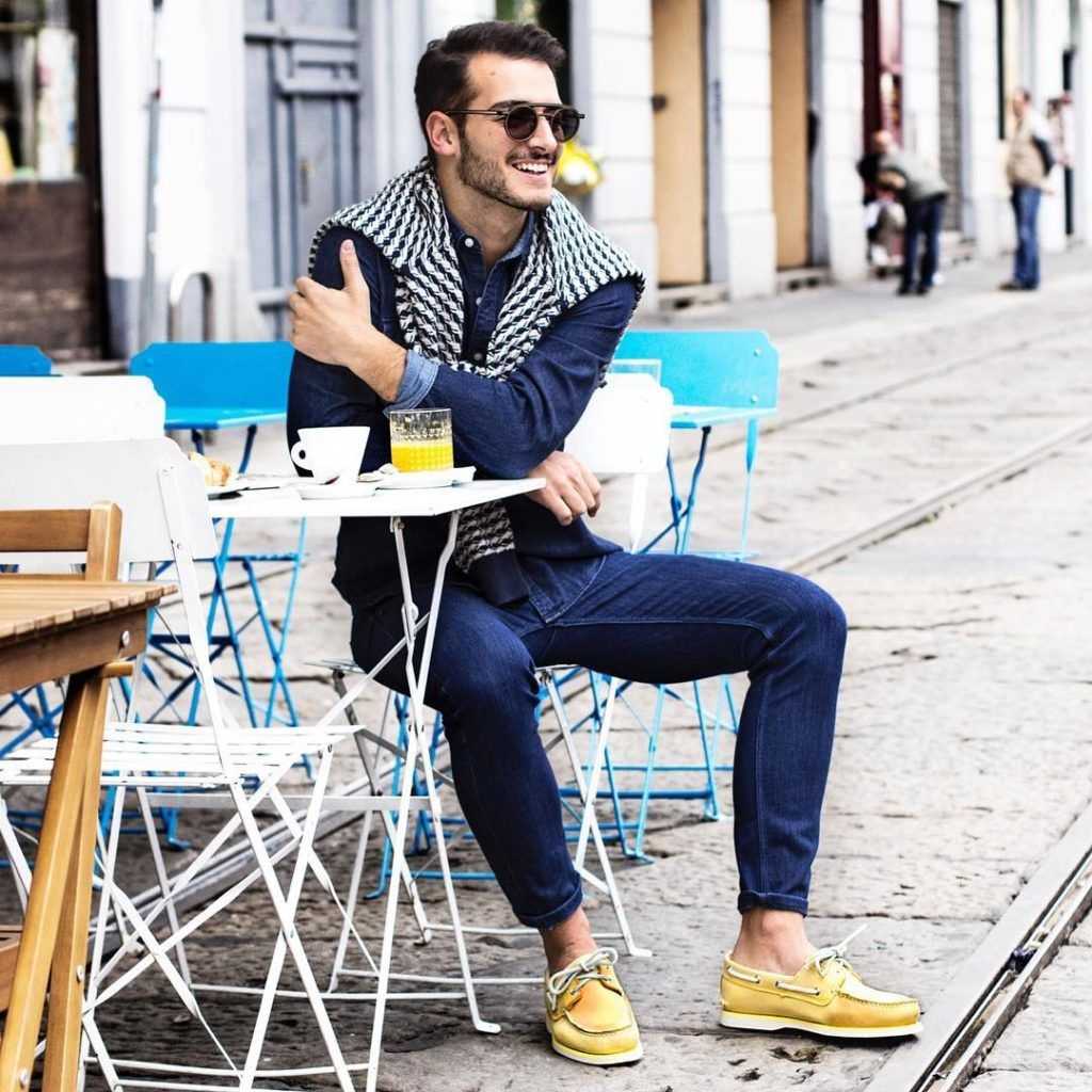 С джинсами. Пожалуй, наиболее популярный и востребованный вариант, адаптированный для современной городской среды. В приоритете зауженные книзу модели с возможностью отворота. В качестве верха уместна футболка, поло, рубашка или джемпер. Интересные варианты получаются при совмещении джинсовых штанов классического кроя с белой рубашкой и приталенным пиджаком в цвет топсайдеров.