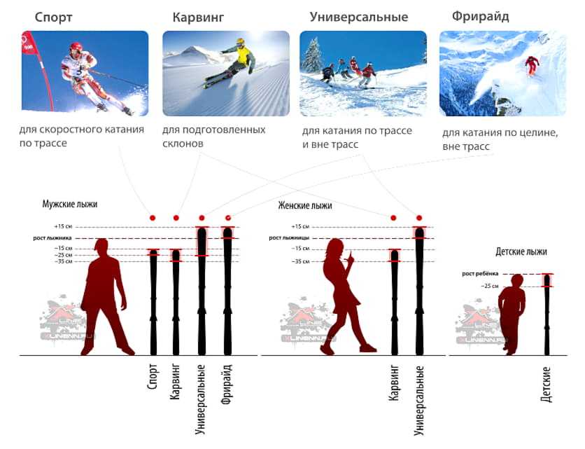 В некоторых спортивных магазинах есть разделение моделей на женские, мужские, детские, туристические и так далее. Однако эти критерии не являются главенствующими. Больший упор стоит делать на технические характеристики снаряжения. Например, перед тем, как подобрать длину лыж, стоит учесть не только стиль катания, но и рост спортсмена.