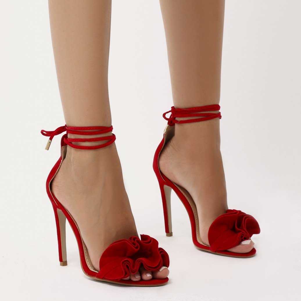 - На каблуке. Алые босоножки на высоком каблуке – это эффектно, вызывающе, сексуально. Однако для повседневных образов такая пара не подходит. Уместно надеть открытые туфли на праздничное мероприятие или романтическое свидание.