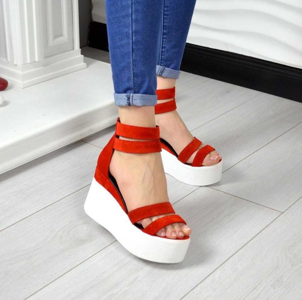 Для создания луков в стиле кэжуал красные босоножки на танкетке носят с укороченными обтягивающими брючками, кюлотами, шортами, однотонными и принтованными платьями и сарафанами свободного кроя.