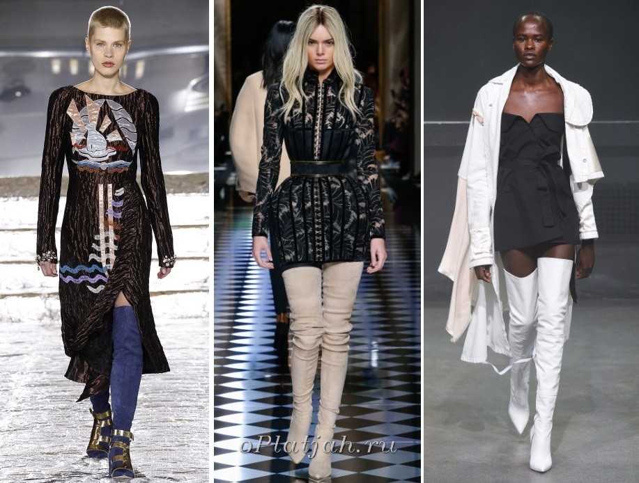 Узор на черном платье позволяет поэкспериментировать с оттенками высокой пары. Цветная палитра узора порадует модниц многовариантностью оттенков женских ботфортов под платье. Хороши в сочетании одинаковые по цвету обувь и верхняя одежда, которая должна обязательно дополнять друг друга в модном образе. Например, расстегнутый белый плащ и ботфорты в комплекте с черным платьем создают гармоничный образ.