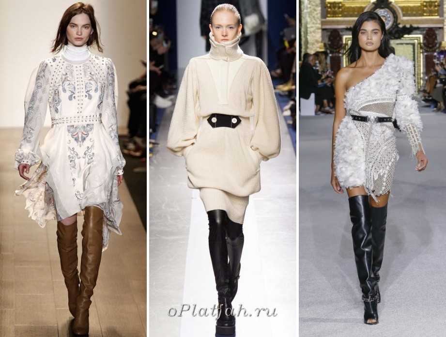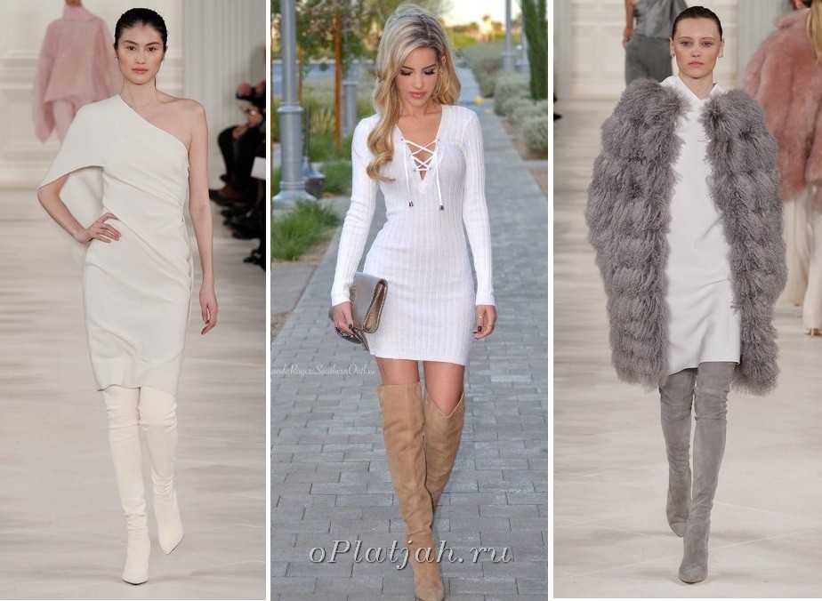 Ботфорты под белое платье также подбирают, как и под черное. Самый простой вариант — под цвет наряда или в пастельных оттенках, приближенных к белому цвету.