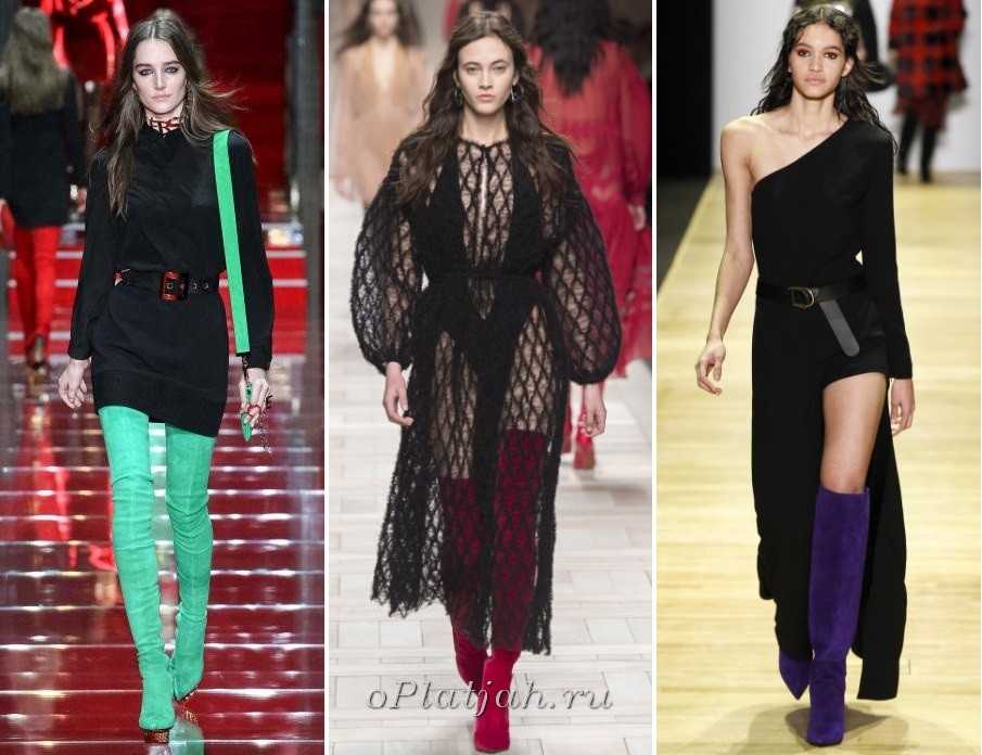 Черное платье — это прекрасный повод надеть ботфорты броских оттенков, если иные тона одежды будут вызывать вопросы. Темная база станет прекрасным поводом для составления неординарных и при этом достаточно изысканных образов.