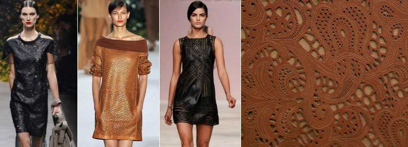Кожаные платья-паутинки, юбки, блузы, топы, верхняя одежда (куртки, плащи) из перфорированной кожи выглядят очень эффектно, приобретая благодаря разнообразным тиснениям и прорезям оригинальный внешний вид, дополняемый высокой функциональностью и отличными эксплуатационными характеристиками натуральной кожи.