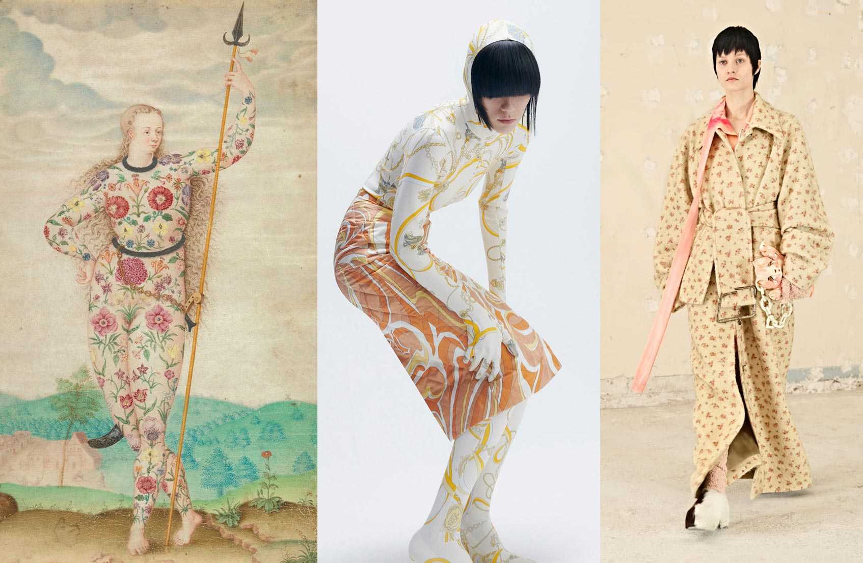 Мелкие цветочки, будто из полевого букета, на нюдовом костюме Acne Studios напоминают рисунки на теле. Этот мотив пришел в современную моду с гравюры XVI века. На ней изображена девушка-воительница, покрытая флористическими татуировками. Дочь загадочных шотландских пиктов мелькнет то в коллекции Ричарда Куинна, то на съемке Юлдус Бахтиозиной. Еще одна важная тема этого источника — тотальный орнамент — продолжается в лукбуке Emilio Pucci и уходит в глубокую логоманию.