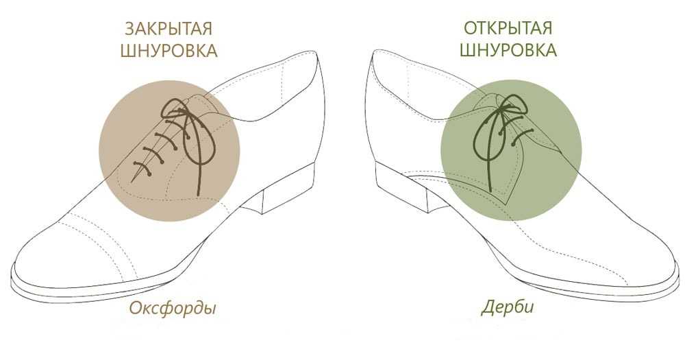 У оксфордов шнуровка закрытая: боковые части (берцы) с отверстиями для шнурков полностью пришиты к основной части туфель. На дерби между берцами есть небольшое расстояние. А еще берцы на такой обуви легко приподнять пальцем. Потому что они не пристрочены к союзке (основной части) целиком. Это открытый тип шнуровки. Не так уж трудно запомнить: всё зависит от того, «открываются» ли боковые части туфель.