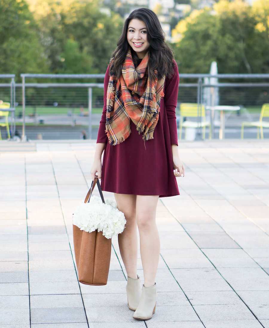 Создать более романтичный, «теплый» образ так же поможет наряд цвета марсала. Этот цвет идеально сочетается с осенними оттенками: теплым оранжевым, шоколадным, молочными… Поэтому, вооружаемся платьем с длинными рукавами свободного кроя с юбкой полусолнцем, теплым шерстяным шарфом в тонах, описанных выше, и молочно-серыми низкими ботиночками на среднем каблуке. Добавляем рыже-коричневую крупную сумку, немного магии – и вуа-ля образ готов!