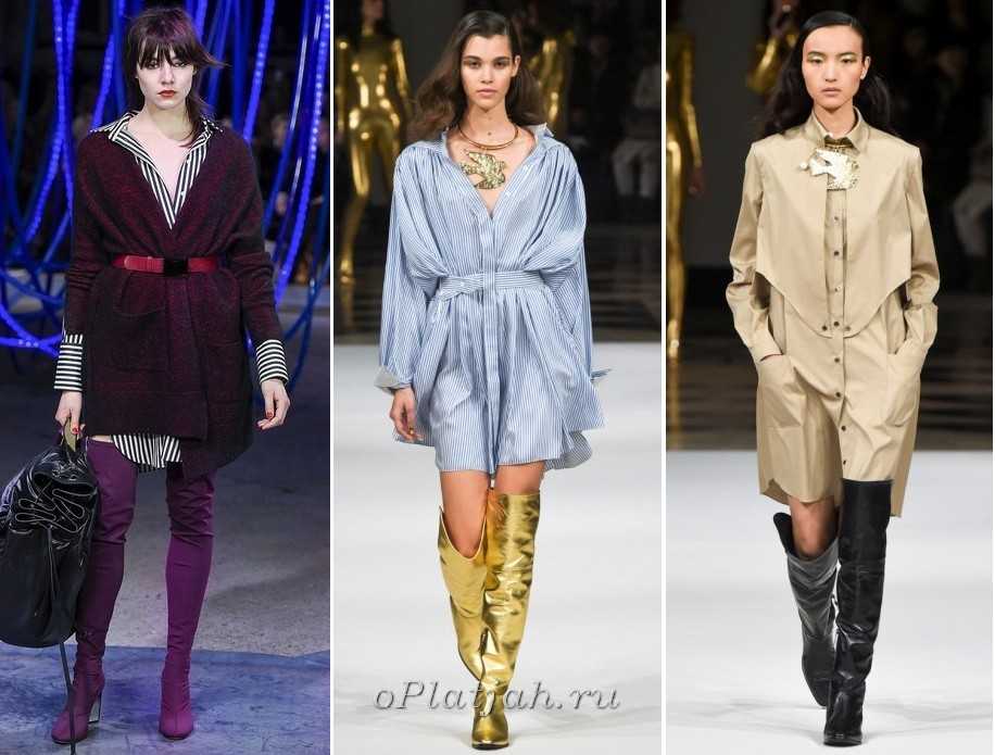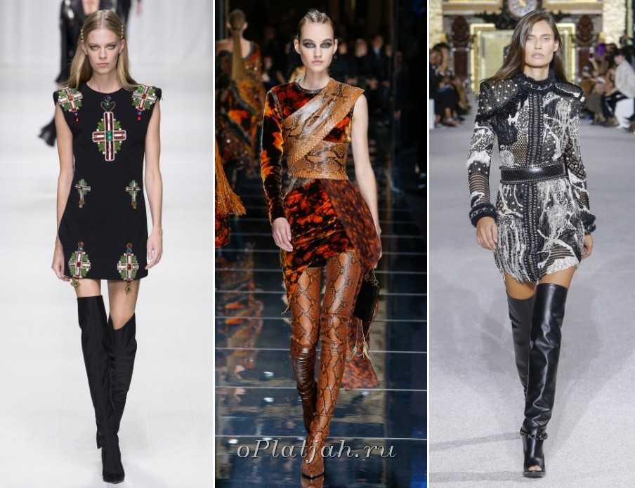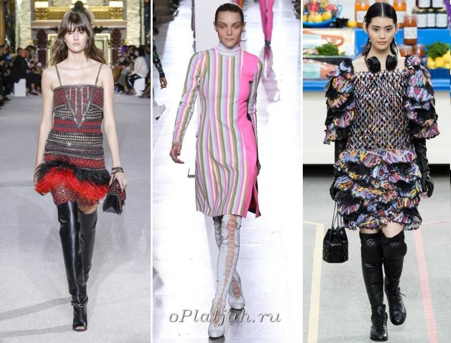 Короткие платья мини сочетаются с высокой обувью, достигающей до середины бедра и выше. В модных показах в таком дуэте все чаще отсутствует разрез между низом одежды и обувью.