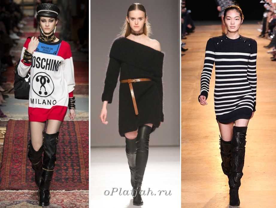 Платье свитер — один из часто используемых видов одежды, который сочетаются с ботинками. Теплые наряды носят с поясами, в прохладные дни комбинируют с плащами, куртками, пальто.