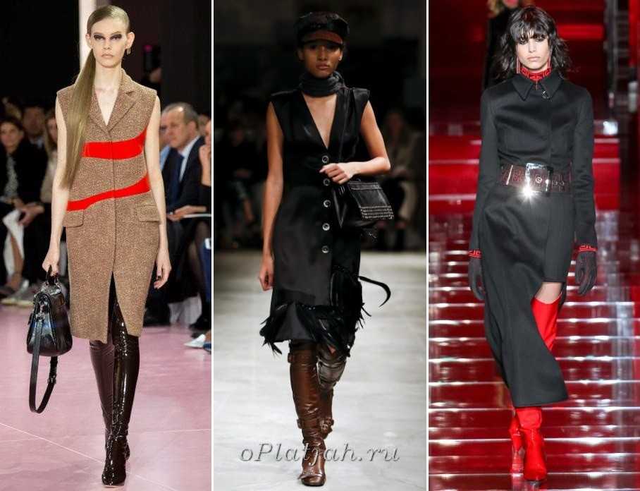 Гармоничным союзом можно назвать платье-пальто с ботфортами. Фасоны одежды без рукавов и закрытые наряды помогут разнообразить осенние и осенние комплекты модниц.