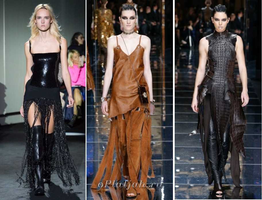 Модным ансамблем является вечернее платье с ботфортами, украшенное бахромой или многочисленными разрезами на юбке.