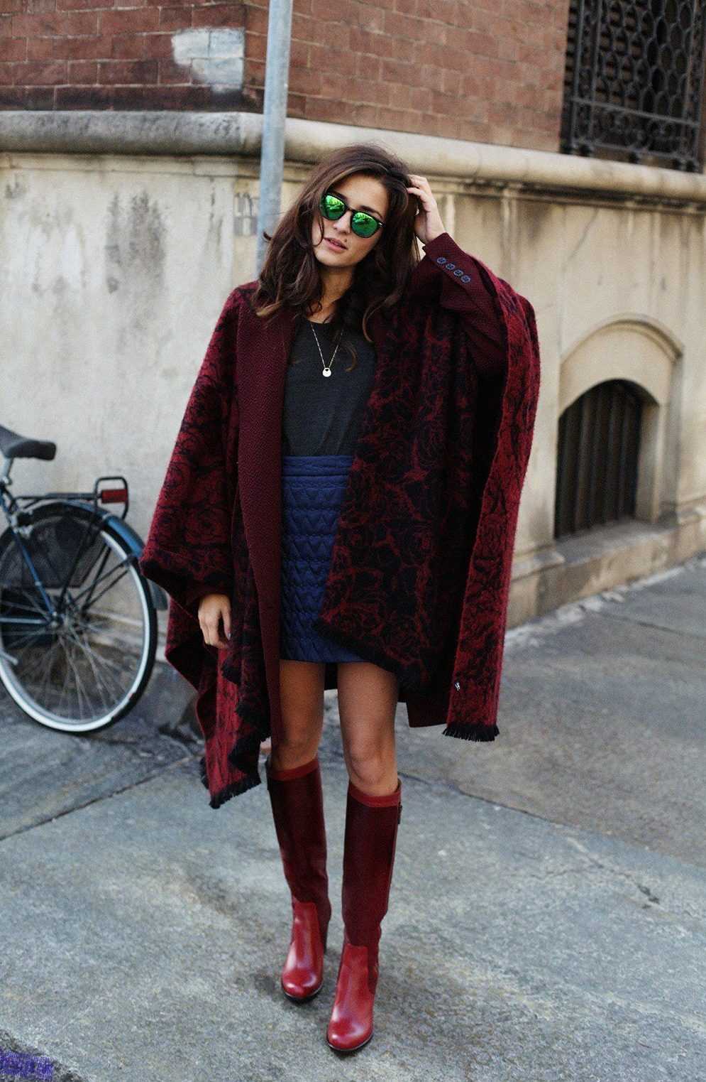 Простая схема: соберите образ из вещей одного цвета или близких оттенков и добавьте к ним коричневые сапоги. Синее платье плюс сапоги, зеленая юбка и свитер плюс сапоги – посмотрите, как это делают девушки из нашей подборки.