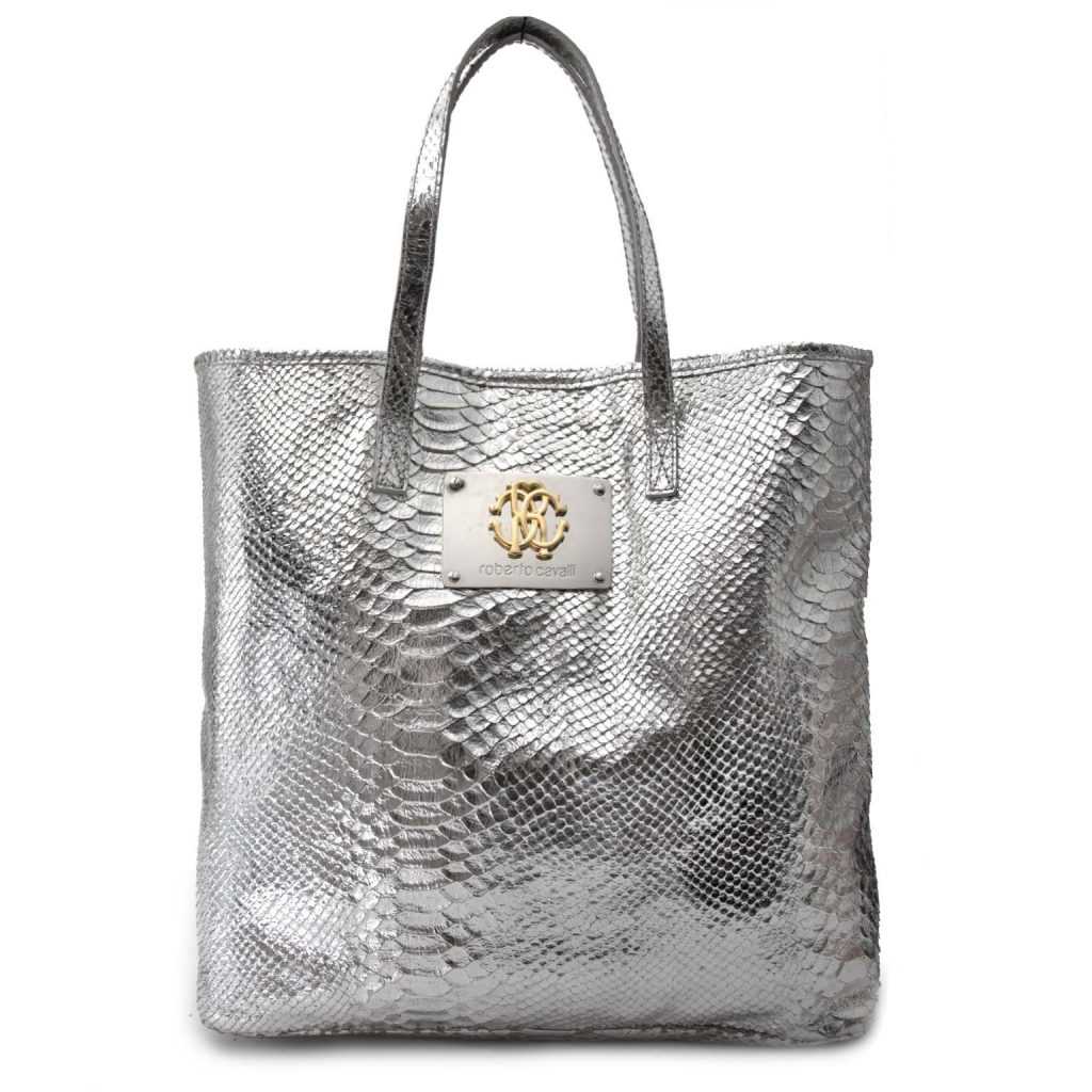 - У маленькой сумки серебристого цвета из кожи питона присутствует симметричный рисунок с крупными пятнами по центру. Жесткая форма, серебристая фурнитура, а также небольшой кожаный ремешок, позволяющий удерживать сумку на запястье, подчеркивают элегантность и своеобразие модели.