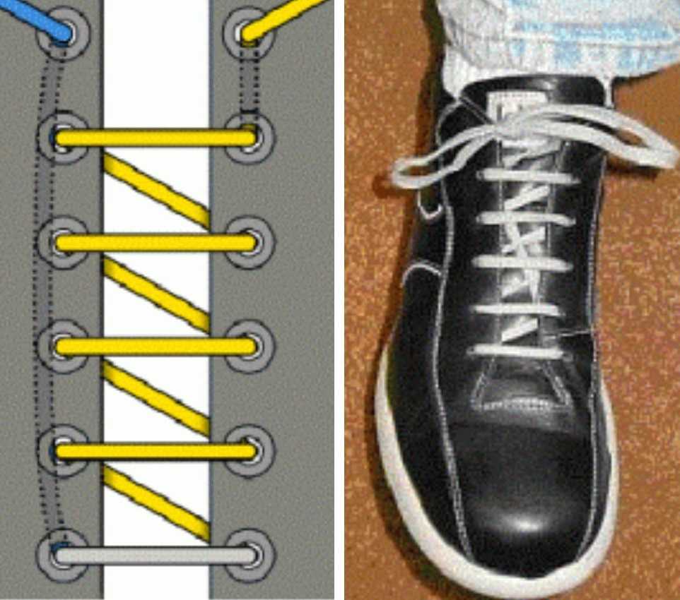 Этот практичный метод подходит для спортсменов, скалолазов и военных — в случае травмы разрезать шнурки можно одним движением. Начинается шнурование с нижних отверстий, при этом один конец лучше оставить меньшей длины. Порядок такой: