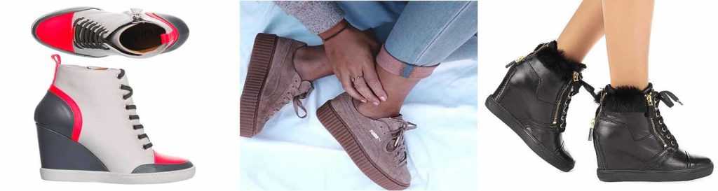 - Подошва – из мягкой резины, средняя по высоте между кроссовками и кедами, но особую популярность приобретают сникерсы на танкетке.