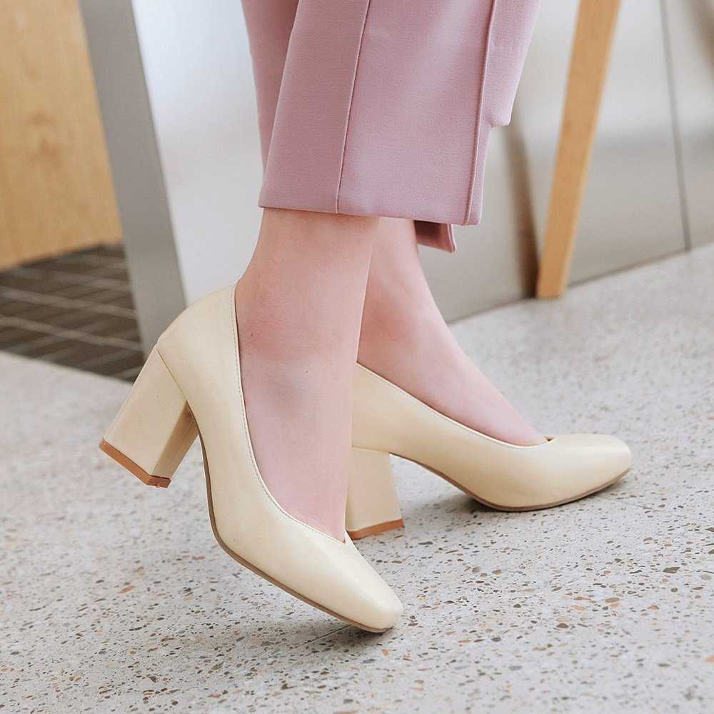 - Туфли-лодочки с широким каблуком от 3-4 до 7 см подойдут для дамы солидного возраста или юной студентки. Однако зрительно они несколько удлиняют стопу, поэтому рекомендуются представительницам прекрасного пола с небольшим размером ноги. Лодочки на толстых каблуках выглядят стильно и привлекательно, они отлично дополняют классический и деловой стиль одежды, являясь удобными и надежными.