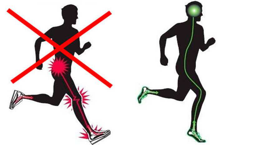 Приземление на носок ( подушечку стопы). Чтобы во время приземления на ногу при беге, правильно срабатывала естественная амортизация суставов, необходимо приземлятся на носок. Желательно, стараться не цеплять пятками поверхность, по которой Вы бегаете. Прямое приземление на полную стопу с прямым участием пятки или же полное приземление ноги с пятки и далее на всю стопу напрямую бьет массой всего тела по всем суставом. Оказывается прямая ударная нагрузка на сложные и хрупкие суставы голеностопа, коленей, поясничные суставы и позвоночник, включая позвоночник без амортизационного смягчения. Боль в перечисленных суставах будут ощущаться уже с первых пробежек.