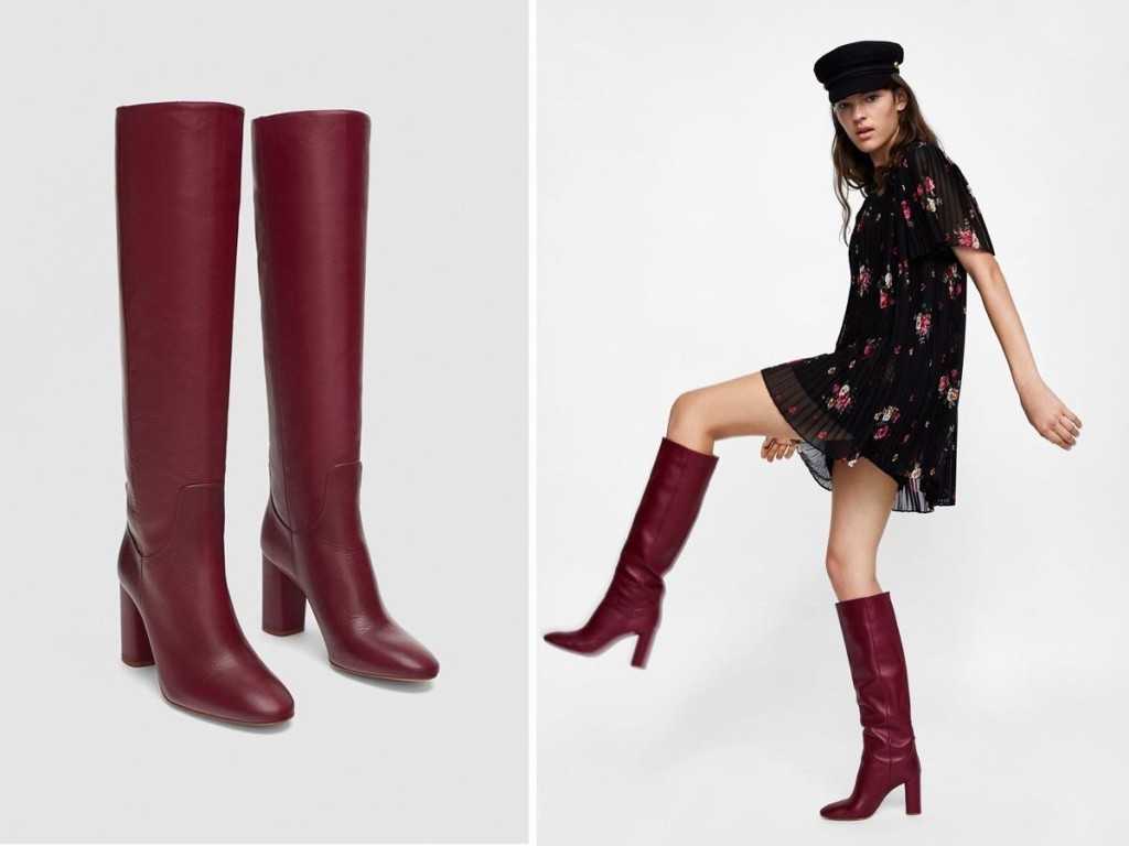 Модные ботфорты могут быть широкими по всей длине голенища либо расклешенными у колена. Что касается носов, в тренде сейчас круглые и зауженные варианты. Каблук может быть любым — классическая шпилька или устойчивый квадратный, его высота тоже вариативна. Есть модели с плоской или массивной подошвой, платформой или танкеткой.