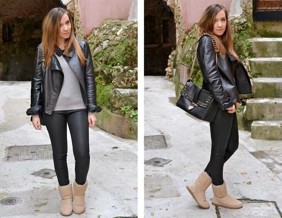 Замшевые угги за счет материала очень объемны, поэтому особенно выигрышным выглядит их сочетание с дутыми куртками и пуховиками, которые как бы балансируют образ. Бежевый цвет является их естественным оттенком, поэтому особенно хорошо они смотрятся с другими природными материалами — шерстяными вязанными свитерами, объемными шарфами и палантинами, пончо, которые относят к этническим корням этого вида обуви.