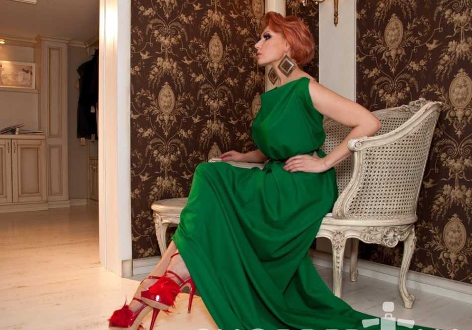 Справа: изумрудное платье в пол, красные туфли и аксессуары