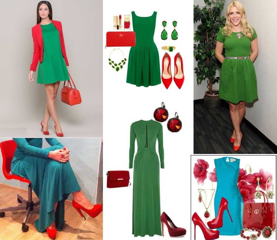 Казалось бы, зеленый и красный — совершенно два противоположных цвета. Кроме того, красный — цвет «теплый», а зеленый, тем более изумрудный, «холодный». Однако сочетание изумрудного платья и красных туфлей — одно из самых лучших.