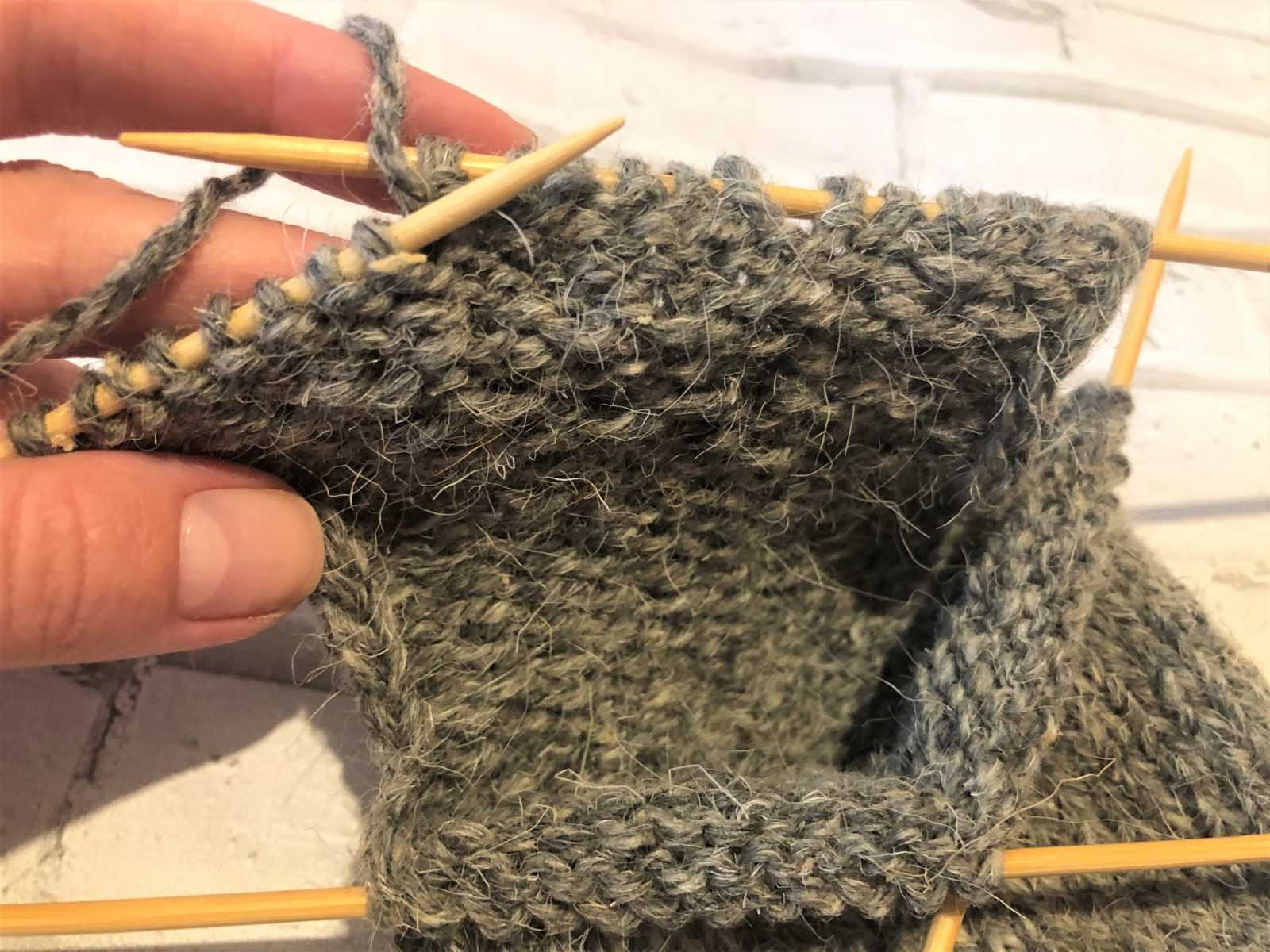 Теперь соединяем вязку двух спиц в одну и провязываем на них 6 см (высота пяточки), в зависимости от подъема ноги можно незначительно увеличить.