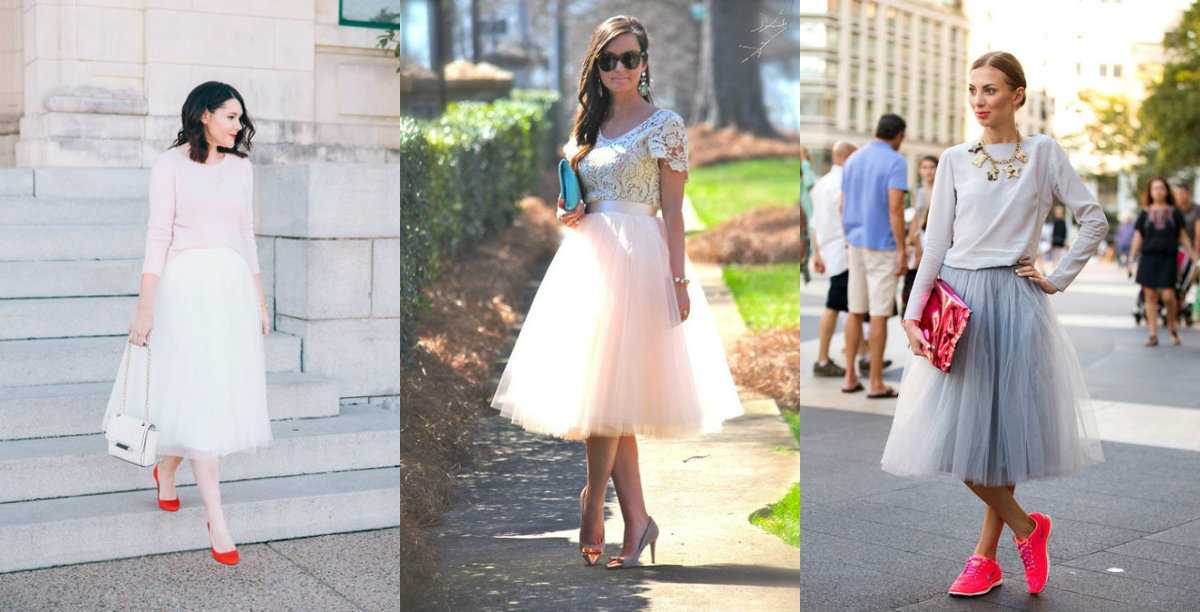 С чем носить пышную юбку из фатина и какую обувь выбрать, зависит от статуса мероприятия. Для торжественного приема нужен гламурный и экстравагантный лук, а для обычной прогулки по парку достаточно простых и незатейливых комбинаций.