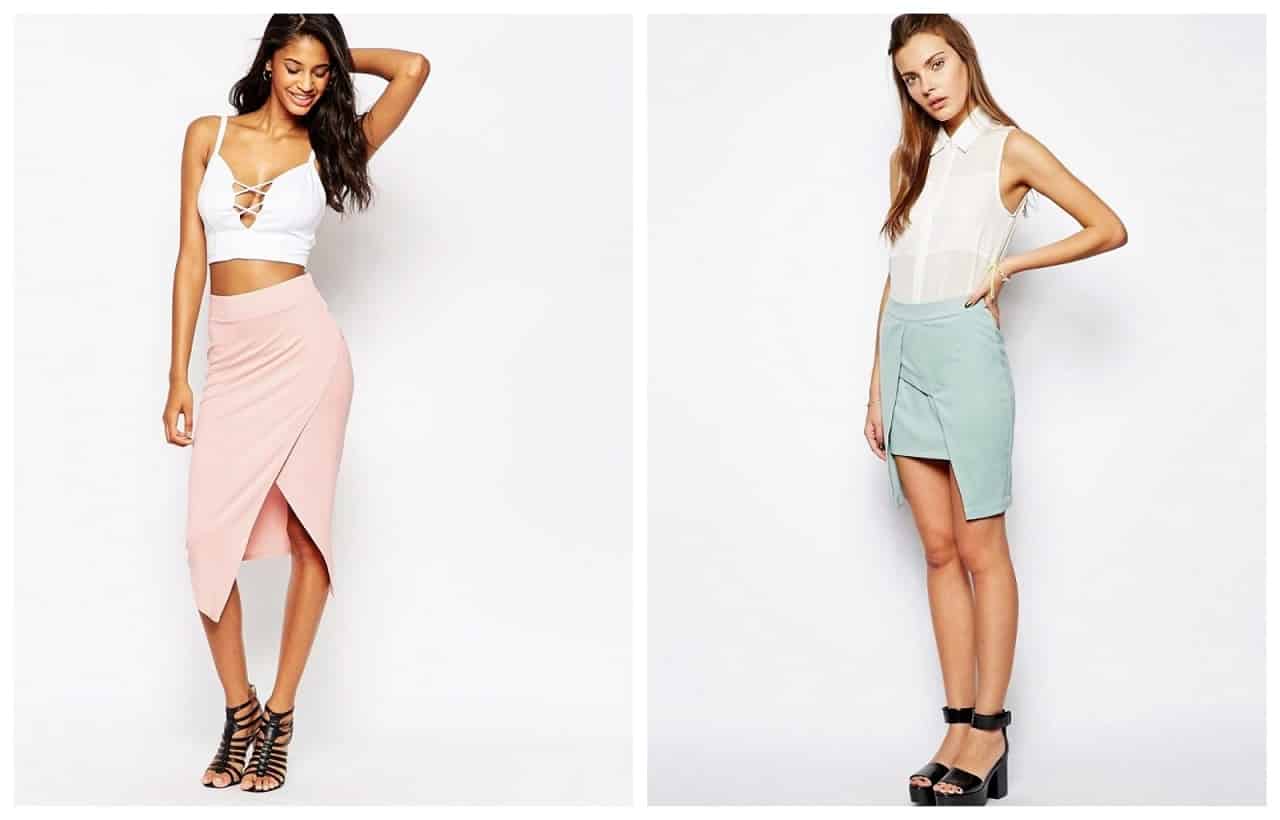 Юбка с запахом – универсальная модель, которая хорошо смотрится на фигуре любого типа. Новинка этого сезона – модели из плотных, хорошо держащих форму материалов, изюминку которым придает асимметричный крой – части, замыкаемые поясом, разные по длине.