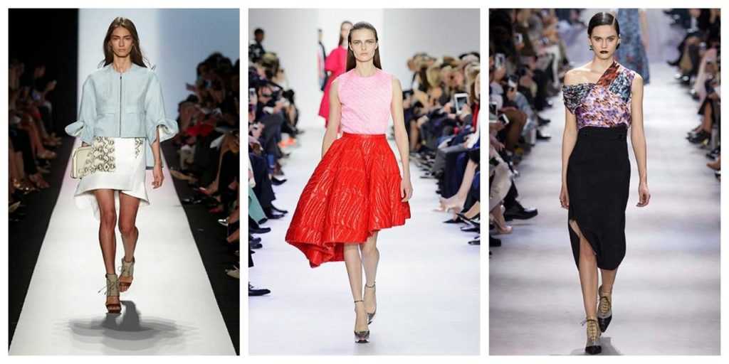 Что касается тканей и актуального кроя, тут стоит обратить внимание на легкие и невесомые юбки, на сатиновые, плиссе, кружевные и асимметричные модели